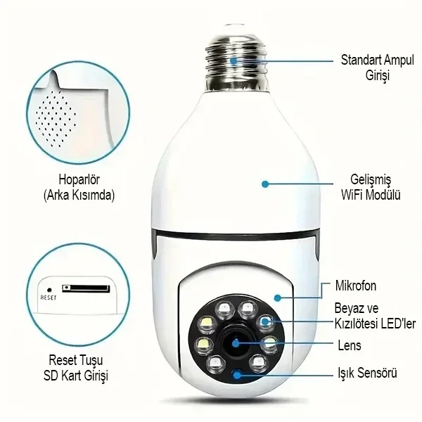 Kolay Kurulum Evinizdeki standart ampul yuvasına takılabilen bu kamera, ekstra kablo veya karmaşık kurulum gerektirmez. Basit bir şekilde takıp kullanmaya başlayabilirsiniz